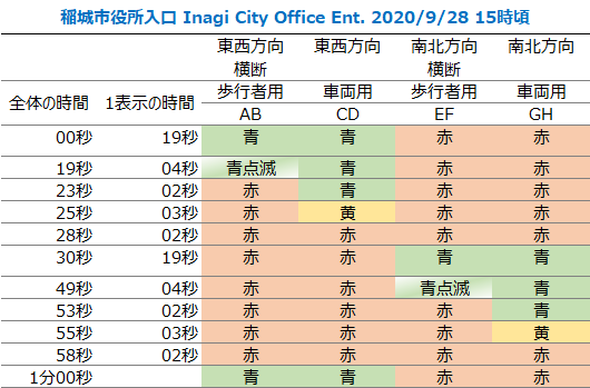 東京都稲城市にある、「稲城市役所入口(いなぎしやくしょいりぐち)(Inagi City Office Ent.)」交差点の信号サイクルを調べました。